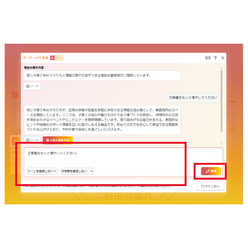 内容を調整したい場合は、リクエストやトーンを変更し、再度 [作成] をクリックします。